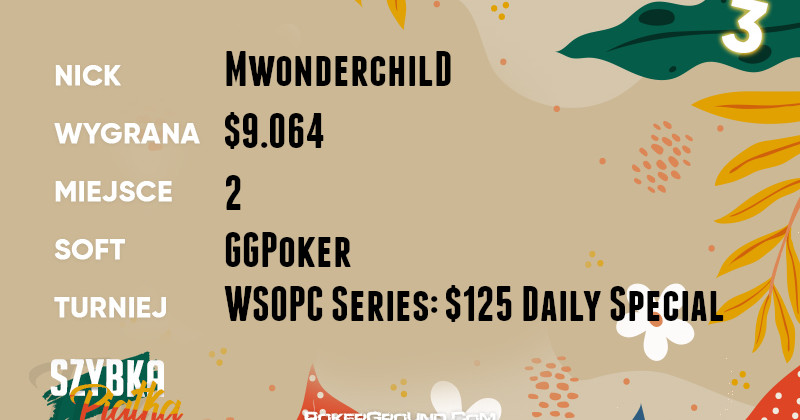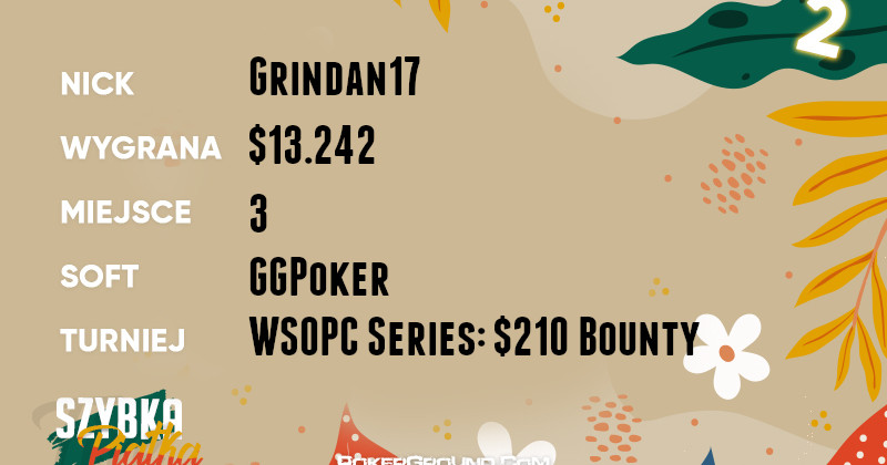 Z kolei drugi wynik dzisiejszego zestawienia, padł na platformie GGPoker. W turnieju WSOPC Series: $210 Bounty, również na trzecim miejscu, zameldował się Grindan17. W kasie otrzymał wypłatę w wysokości $13.242.
