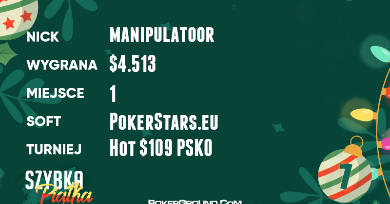 Trzy zwycięstwa znalazły się w dzisiejszym zestawieniu, a najwyższe z nich odniósł manipulatoor. Nasz gracz punktował po kolei rywali w rozgrywce Hot $109 PSKO, aż finalnie na placu boju pozostał sam. Za swój wyczyn otrzymał $4.513.