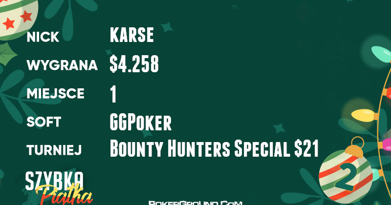 Niewiele mniej, a konkretnie $4.258, trafiło na konto drugiego w rankingu karse. Akcja działa się na platformie GGPoker, a konkretnie w rozgrywce Bounty Hunters Special $21. Polak nie znalazł tam pogromcy i mógł się cieszyć z przyzwoitej wygranej.