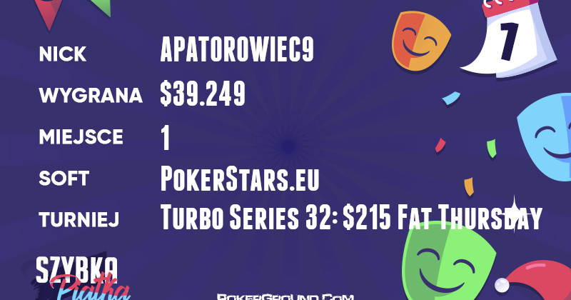 Tytuł stachanowca i zasłużone pierwsze miejsce w zestawieniu, wędruje do sztygara o nicku APATOROWIEC9. Pokazał on, jak robota powinna być zrobiona w rozgrywce Turbo Series 32: $215 Fat Thursday, a za swój wyczyn otrzymał $39.249.