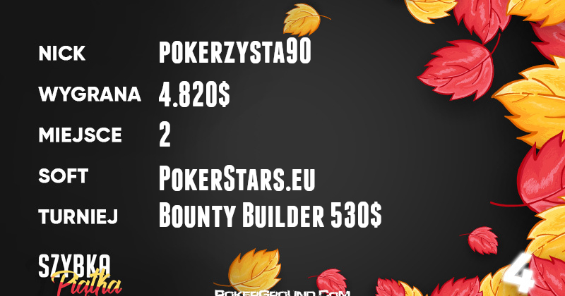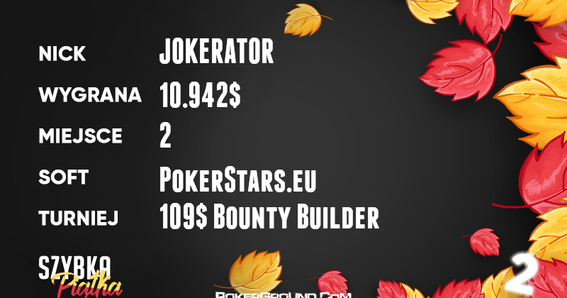 Innym graczem, którego chcemy dzisiaj wyróżnić, jest JOKERATOR. Jego niemal perfekcyjny występ, który zakończył się zajęciem drugiego miejsca w turnieju 109$ Bounty Builder, jest kolejnym sukcesem w bogatej karierze tego gracza. Tym razem skończyło się drugim miejscem na podium i plus 10.942$ w kieszeni. Zacnie.