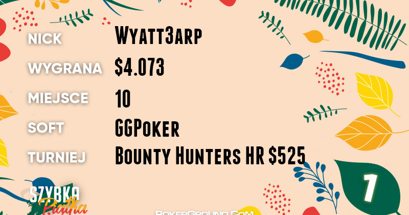 Najlepszym rezultatem legitymuje się Wyatt3arp. Przygodę na GGPoker w rozgrywce Bounty Hunters HR $525 zakończył na miejscu dziesiątym. Do jego kieszeni wpadła kwota wynosząca $4.073.