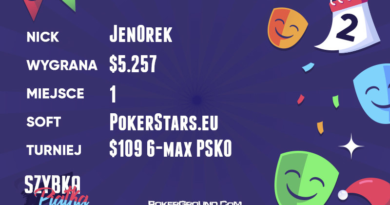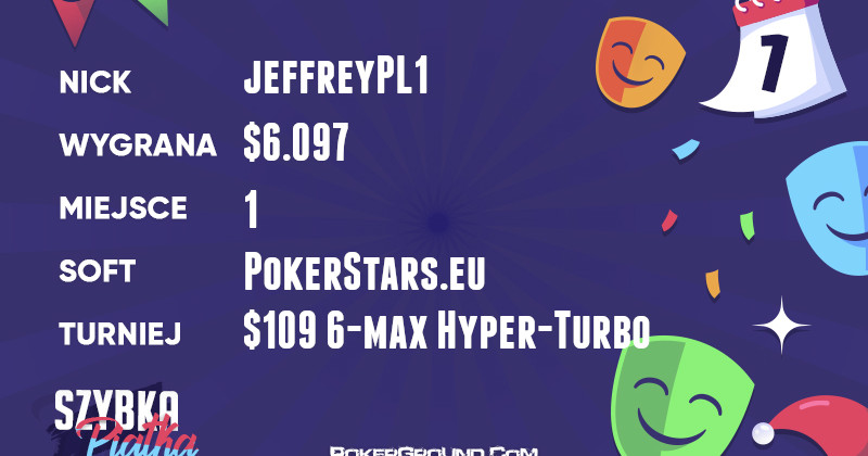 Za każdym razem sprawia nam przyjemność, gdy do „Szybkiej Piątki” wpadają gracze o uznanej klasie, lecz innym niż MTT profilu wykształcenia. Taka sytuacja ma miejsce dzisiaj, bowiem na czele zestawienia zameldował się jeffreyPL1. Wszystko dzięki wygranej w turnieju $109 6-max Hyper-Turbo i zgarnięciu $6.097.