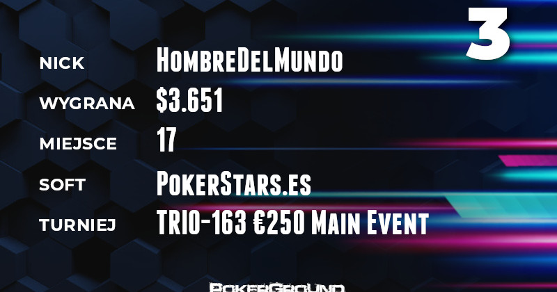 Na platformie PokerStars.es dobiega końca festiwal TRIO. Mieliśmy pewne szanse w Turnieju Głównym, jednak marzenia o zwycięstwie zatrzymały się na siedemnastym miejscu. Tam z rozgrywką pożegnał się ostatni z Polaków – HombreDelMundo – zgarniając $3.651.