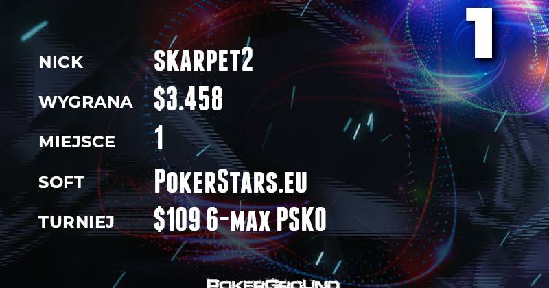 Żółty plastron lidera przyodziewa dzisiaj skarpet2, który wspaniale poczynał sobie w rozgrywce $109 6-max PSKO. Nasz reprezentant finalnie nie znalazł pogromcy i mógł cieszyć się z wygranej wynoszącej $3.458.