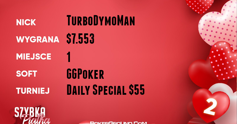 Doskonale spisał się także wicelider TurboDymoMan. Toczył on zażarte boje w rozgrywce Daily Special $55, gdzie finalnie stanął na najwyższym stopniu podium. Dzięki temu wyczynowi do jego portfela trafiło $7.553.