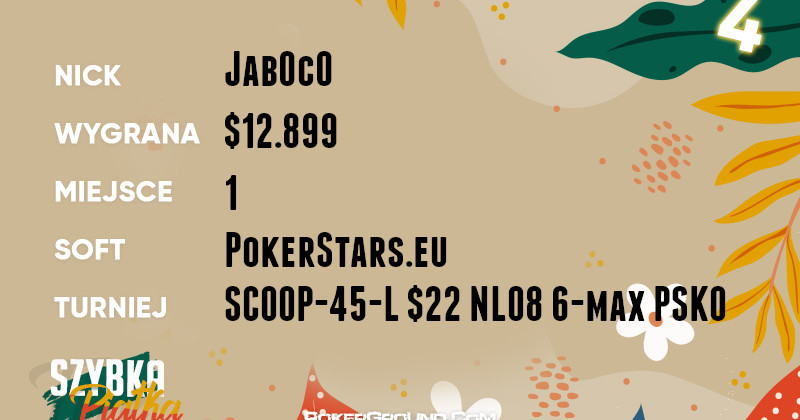 Natomiast w rozgrywce SCOOP-45-L $22 NLO8 6-max PSKO nie miał sobie równych Jab0c0. Nasz grinder, przyodziewający barwy Wielkiej Brytanii, po dwóch dniach zmagań, mógł na koniec cieszyć się z wygranej w kwocie $12.899.
