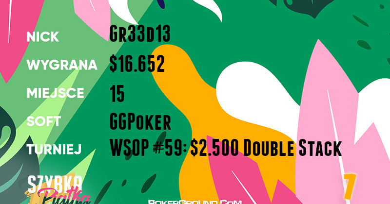 W ciągu dwóch dni zmagań nasi zgarnęli z wirtualnych stołów ponad siedemdziesiąt cztery tysiące dolarów. Spory w tym udział miał lider dzisiejszego rankingu Gr33d13. Dzielnie poczynał sobie w rozgrywce WSOP #59: $2.500 Double Stack, kończąc ostatecznie na miejscu piętnastym. W efekcie zainkasował $16.652.