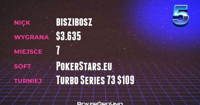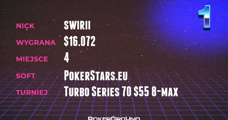 W lutowych zestawieniach nie może zabraknąć kwoty pięciocyfrowej. Tym razem jej autorem został swirii, który dzielnie poczynał sobie w rozgrywce Turbo Series 70 $55 8-max. Ostatecznie poległ podczas batali na finałowym stole, kończąc zawody na czwartym miejscu. Jego konto zasiliła suma wynosząca $16.072.