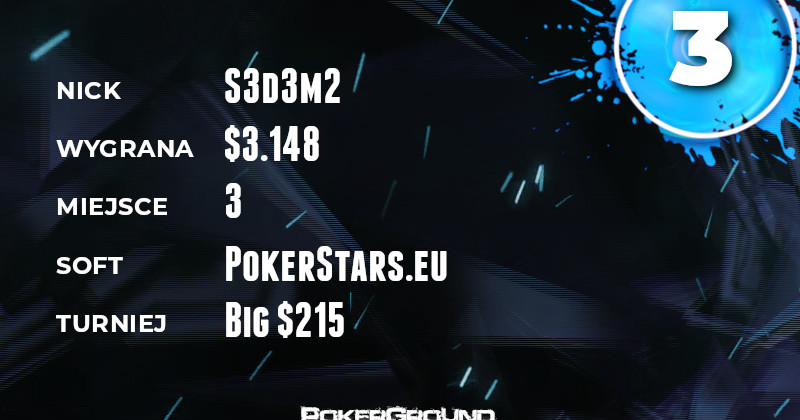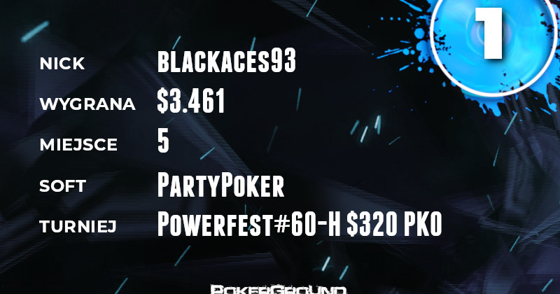 Na czoło dzisiejszej ferajny wybił się blackaces93. Nasz weteran długo pojedynkował się w jednym z eventów Powerfest, a konkretnie #60-H $320 PKO. Ostatecznie zakończył swój udział na miejscu piątym, a z kasy odebrał $3.461.
