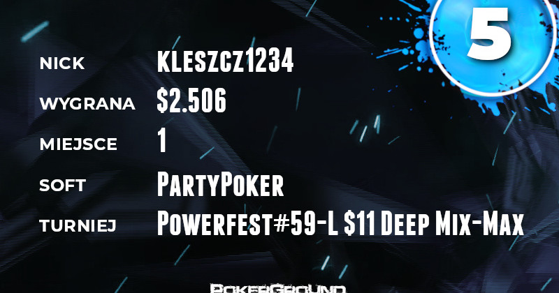 Pozostając na platformie PartyPoker i przy festiwalu Powerfest, do grona zwycięzców tego prestiżowego wydarzenia dołączył kleszcz1234. Wbijał się w stacki kolejnych rywali i wysysał z nich żetony, aż pozostał sam na placu boju. Miało to miejsce w evencie #59-L $11 Deep Mix-Max,a w nagrodę otrzymał $2.506.