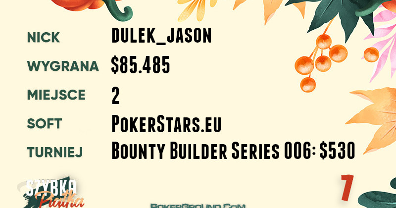 Głównym udziałowcem dzisiejszego sukcesu jest dulek_jason. Weteran wirtualnych bojów zawędrował na drugie miejsce w dwudniowej rozgrywce Bounty Builder Series 006: $530. Dzięki temu wyczynowi zainkasował w sumie $85.485.