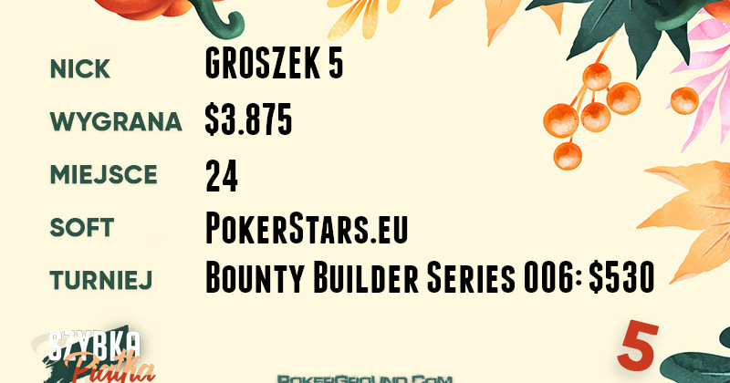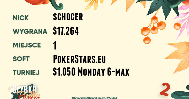 Świetny występ zaliczył także inny z doświadczonych graczy schocer. Nie pozostawił on rywalom żadnych złudzeń we flagowym poniedziałkowym turnieju $1.050 Monday 6-max. Za zwycięstwo nasz rodak odebrał z kasy $17.264.