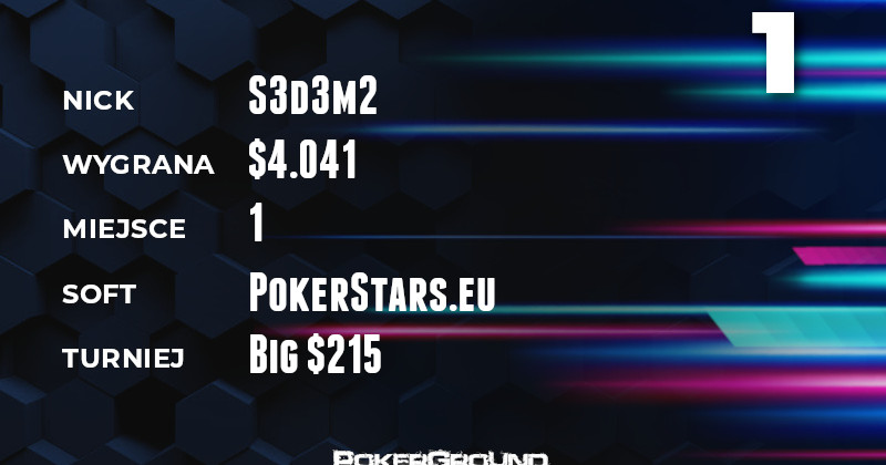 Lideruje nam dzisiaj stary dobry znajomy – S3d3m2. Rozegrał on doskonałe zawody w turnieju Big $215, gdzie ostatecznie nie znalazł pogromcy. Do kasy udał się po wypłatę wynoszącą $4.041.