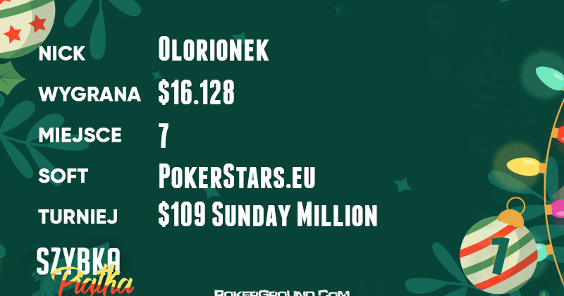 Serduszko zawsze bije mocniej, gdy na stole finałowym mitycznego Sunday Million pojawia się Polak. Taka sytuacja miała miejsce wczoraj, bowiem wśród najlepszej dziewiątki ulokował się Olorionek. Tym razem nasz gracz musiał jednak obejść się smakiem, gdyż jego przygoda zakończyła się na siódmym miejscu i wypłatą $16.128.
