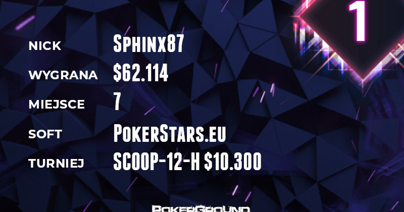 Na festiwalu SCOOP padło kolejne, fantastyczne pięć cyfr. Po Radogoszczu przyszła kolej na innego weterna, po którym mogliśmy się takiego „wybryku” spodziewać. Sphinx87, bo o nim mowa, zajął siódme miejsce w evencie 12-H $10.300. Do kasy udał się po wypłatę w wysokości $62.114.