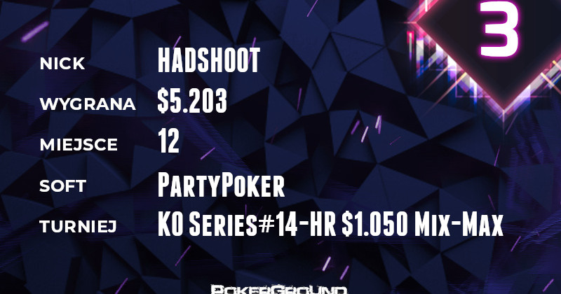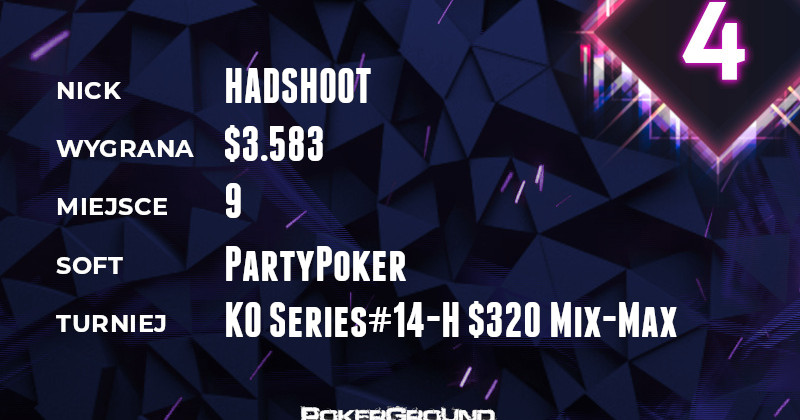 Godnego uwagi wyczynu dokonał wczoraj HADSHOOT. Zameldował się na wysokich pozycjach w dwóch eventach KO Series, oznaczonych tym samym numerem, lecz o innym wpisowym. Łącznie na jego konto powędrowało niemal dziewięć tysięcy dolarów.