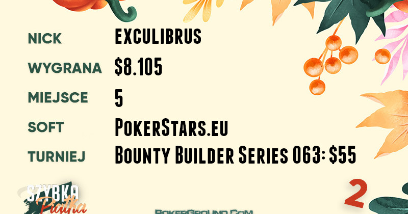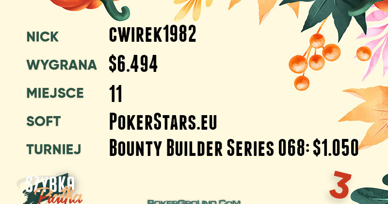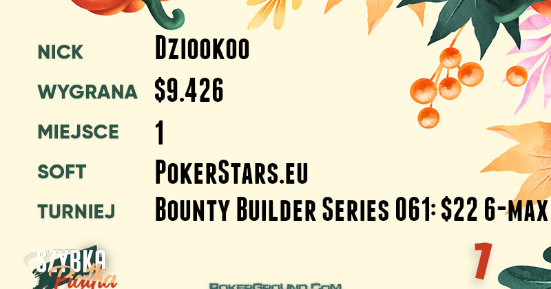 Dzień po dniu biało-czerwoni notują zwycięstwo w evencie Bounty Builder Series. Rzecz działa się w rozgrywce o numerze #061: $22 6-max Turbo, gdzie nie dał szans rywalom Dziookoo. W efekcie, tytułuje się triumfatorem dzisiejszego zestawiania i może cieszyć się z wygranej $9.426.