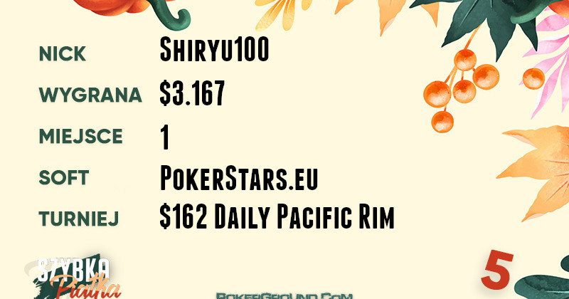 Turniejowym zwycięstwem może pochwalić się także piąty dzisiaj Shiryu100. Podziwiamy za dyscyplinę bowiem już od siódmej rano klikał w guziki. Niemniej opłacało się, gdyż za pierwsze miejsce w turnieju $162 Daily Pacific Rim otrzymał łącznie $3.167.