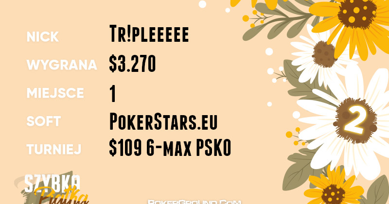 Po raz kolejny klasę potwierdził wicelider rankingu Tr!pleeeee. Nie dał żadnych szans rywalom w rozgrywce $109 6-max PSKO, pewnie sięgnął po zwycięstwo, a do kasy udał się po wypłatę wynoszącą $3.270.
