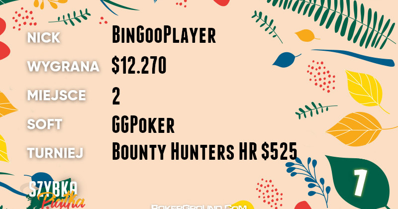 Najlepsze notowania na dzisiejszej liście wyników ma BinGooPlayer. Zwycięstwo w rankingu zapewnił sobie dzięki świetnej postawie w rozgrywce Bounty Hunters HR $525. Polak zawędrował na drugie miejsce, a jego portfel uzupełniła suma $12.270.