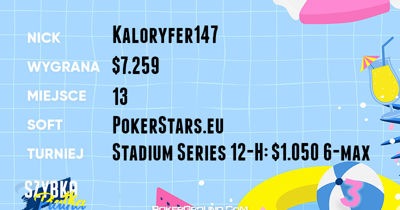 Oczywiście nie zabrakło naszych reprezentantów na festiwalu Stadium Series. Najlepszym rezultatem legitymuje się Kaloryfer147. Zameldował się on na trzynastym miejscu w evencie Stadium Series 12-H: $1.050 6-max, a do konta dopisał $7.259.