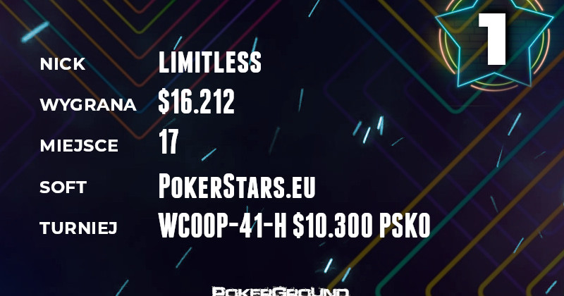 Na pozycji lidera zameldował się limitless, który toczył boje o astronomiczne wypłaty w turnieju WCOOP-41-H, gdzie wpisowe wynosiło $10.300. Ostatecznie, skończyło się na miejscu siedemnastym i kwotą $16.212 na pocieszenie.