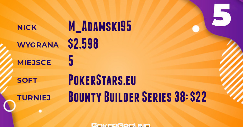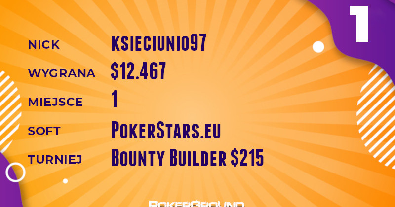 Żółty plastron lidera przyodziewa dzisiaj ksieciunio97. Nie pozostawił on rywalom żadnych złudzeń w rozgrywce Bounty Builder o wpisowym $215. Lider zestawienia udał się do kasy po wypłatę wynoszącą $12.467.