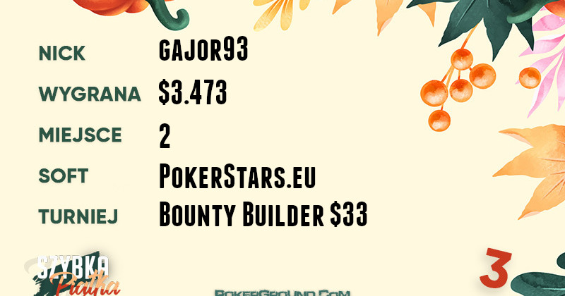 Z kolei na PokerStars.eu największy zarobek jest autorstwa gajora93. Akcja miała miejsce w rozgrywce Bounty Builder $33, gdzie nasz reprezentant zajął, tak zgadliście, drugie miejsce. Dzięki temu rozstrzygnięciu zarobił $3.473.