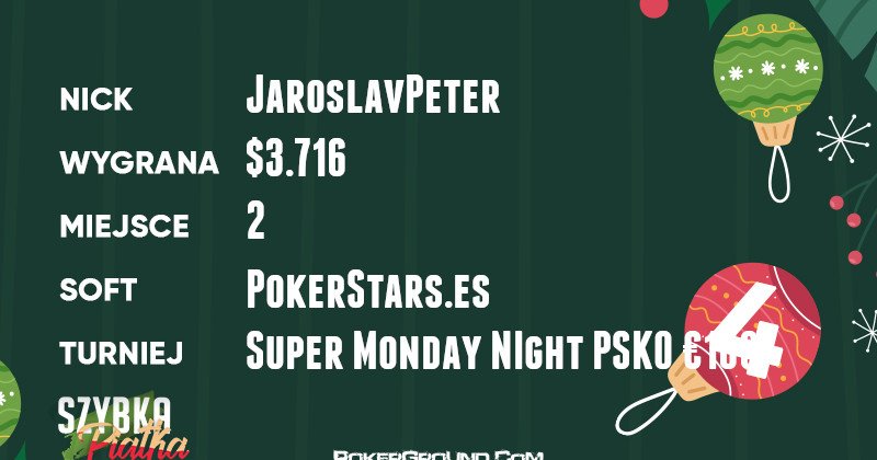 Z kolei JaroslavPeter, czwarty w rankingu, wykręcił najlepszy rezultat na pozostałych platformach. Rzecz działa się w turnieju Super Monday Night on Stars PSKO €100, gdzie nasz reprezentant zajął drugie miejsce, zgarniając $3.716.