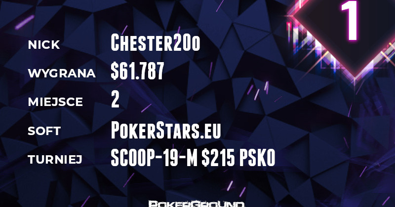 Powyższa kolejność nie jest przypadkowa, bowiem to właśnie Chester20o rządzi w dzisiejszym rankingu. Dosłownie otarł się o zwycięstwo (podobnie zresztą jak bartek901) w evencie SCOOP-19-M $215 PSKO. Za drugie miejsce otrzymał $61.787.