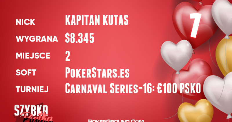 Niewiele brakowało, żeby lider dzisiejszego zestawienia – KAPITAN KUTAS – mógł się tytułować zwycięzcą nie tylko naszego rankingu, ale także eventu Carnival Series #16. Niestety, w heads-upie zabrakło nieco szczęścia i ostatecznie zakończyło się na drugim miejscu i wypłatą $8.345.