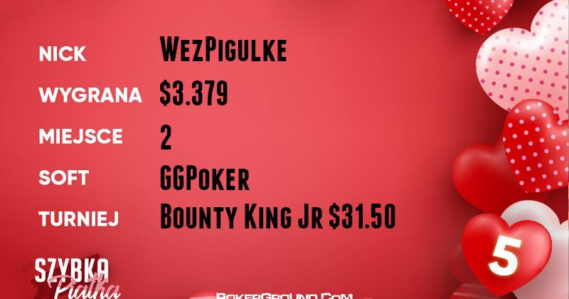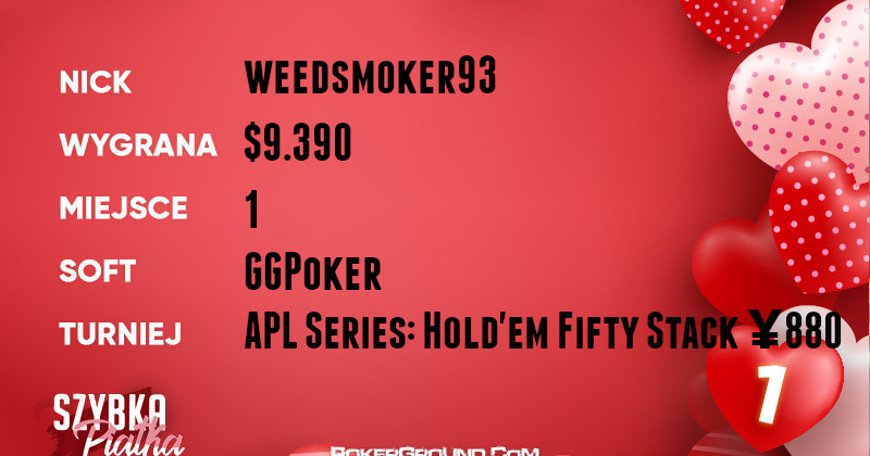 Najbardziej okazałe zwycięstwo odniósł weedsmoker93. Akcja rozgrywała się na platformie GGPoker w festiwalowym turnieju APL Series: Hold’em Fifty Stack ¥880. Nikt nie był w stanie ograć naszego reprezentanta, który w efekcie zainkasował $9.390.