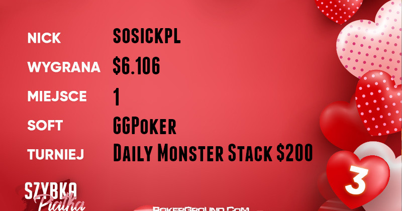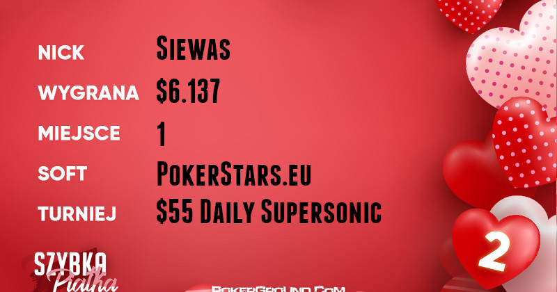 Imponującego wyczynu dokonał Siewas, wicelider rankingu. Drugi raz w tym tygodniu stanął na najwyższym stopniu podium w rozgrywce $55 Daily Supersonic. Dzięki temu cieszył się z wygranej w kwocie $6.137.