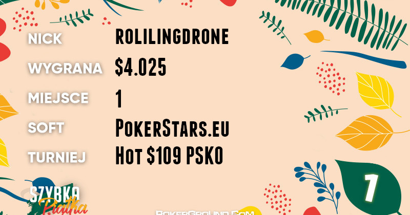 Spod klątwy „łotrzyka” zdołał uciec lider dzisiejszego zestawienia rolilingdrone. W pełni wykorzystał swój skillset aby odnieść przyzwoite zwycięstwo w rozgrywce Hot $109 PSKO. Dzięki temu, jego bankroll wzbogacił się o $4.025.