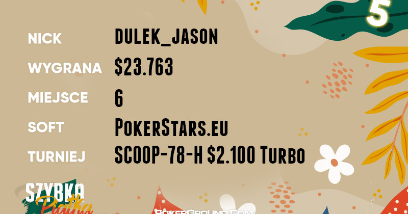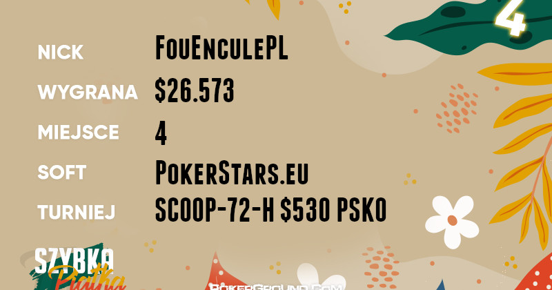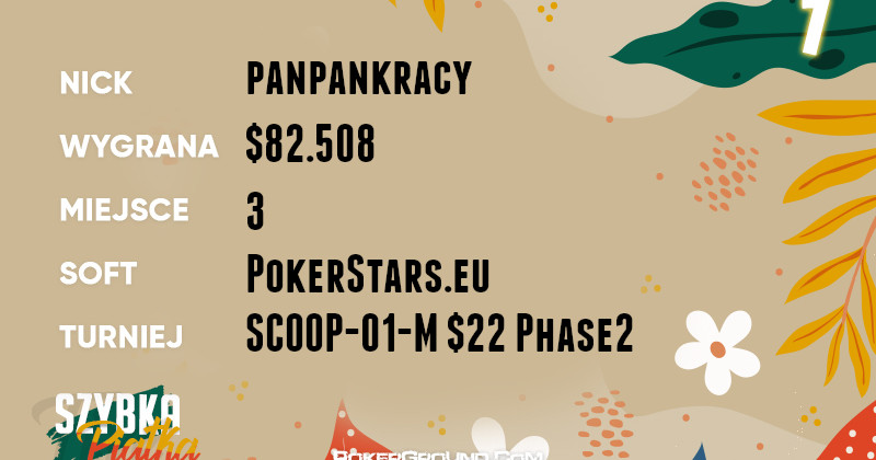 Bez zbędnych wstępów, żółty plastron lidera przyodziewa dzisiaj panpankracy. Dzielnie poczynał sobie w drugim dniu eventu SCOOP-01-M $22 Phase2. Ostatecznie, zakończył swoją przygodę na trzecim miejscu, a jego bankroll zasiliła kwota w wysokości $82.508.