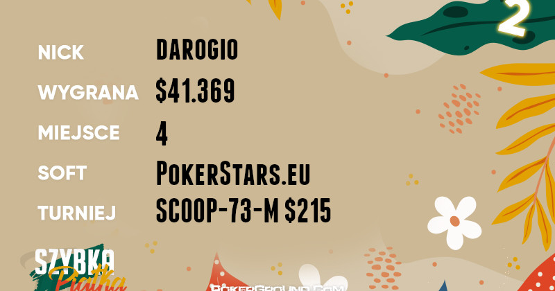 Jako drugi w zestawieniu zameldował się darogio. On z kolei przeżył fascynującą podróż w rozgrywce SCOOP-73-M $215, która trwała aż do finałowego stołu. Nasz reprezentant odpał na miejscu czwartym, a z kasy odebrał $41.369.