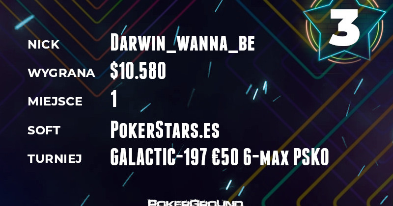 Drugi tytuł mistrzowski powędrował w ręce gracza o nicku Darwin_wanna_be. On z kolei pozbawił rywali wszelkich złudzeń w rozgrywce #197 €50 6-max PSKO festiwalu GALACTIC. Do kasy udał się po wypłatę w wysokości $10.580.