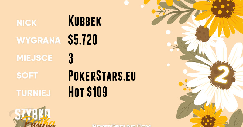 Numer dwa w naszym rankingu to gracz o nicku Kubbek. On z kolei rozgrywał dobre zawody w turnieju Hot $109, gdzie finalnie stanął na najniższym stopniu podium. Do kasy udał się po wypłatę w wysokości $5.720.