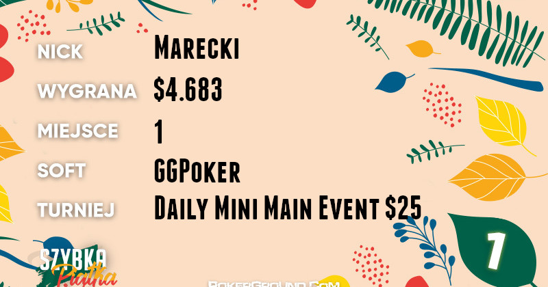 Liderem rankingu mianuje się dziś Marecki. Rozegrał on świetne zawody w rozgrywce Daily Mini Main Event $25 na platformie GGPoker. Stosunek wpisowego do wygranej jest imponujący, bowiem Polak zgarnął $4.683.