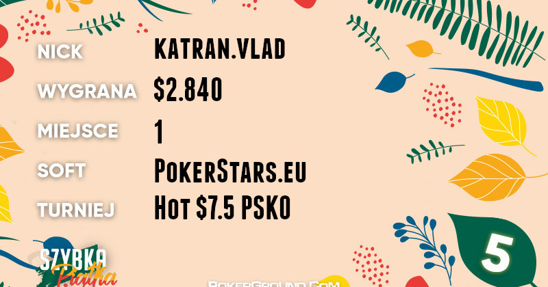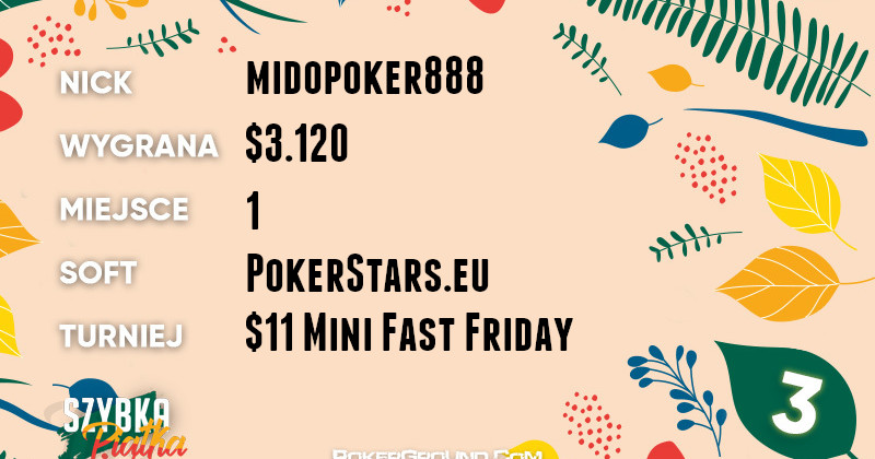 Również zwycięstwem, a jednocześnie najlepszym rezultatem na P*, może z kolei pochwalić się midopoker888. Nie znalazł on pogromcy w turnieju $11 Mini Fast Friday, dzięki czemu mógł cieszyć się z wypłaty w kwocie $3.120.