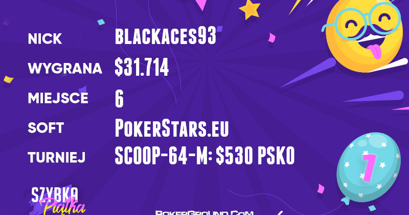 Kierownikiem dzisiejszego zamieszania bez dwóch zdań został obwieszczony blackaces93. Znany bywalec naszych rankingów zajął szóste miejsce w evencie SCOOP-64-M: $530 PSKO. W efekcie, jego na jego koncie pojawiło się dodatkowe $31.714.