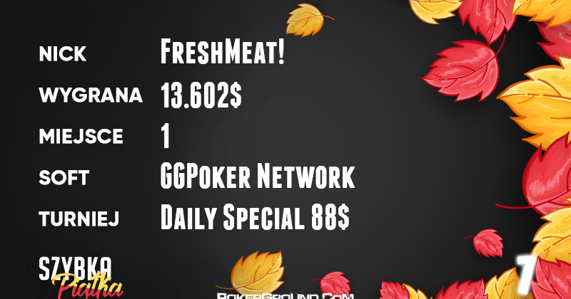 Najlepszy wynik pochodzi z platformy GGPoker. Jego autorem jest FreshMeat!, który zwyciężył w evencie Daily Special $88. Jego sukces został wyceniony na okazałe 13.602$.