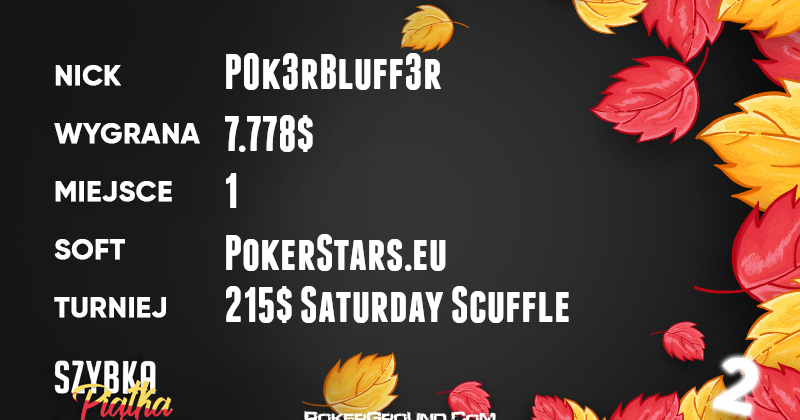 Drugim wynikiem dnia może pochwalić się P0k3rBluff3r, który na PokerStars wygrał turniej 215$ Saturday Scuffle, dzięki czemu wzbogacił się o 7.778$.