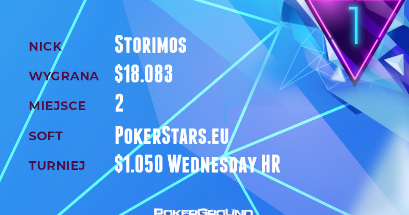 Autorem najlepszego rezultatu dzisiejszego zestawienia, jest nie kto inny jak znany weteran Storimos. Dotarł on na finałowy stół rozgrywki $1.050 Wednesday HR, gdzie ostatecznie zakończył swój udział na miejscu drugim. Do kasy udał się po wypłatę w wysokości $18.083.