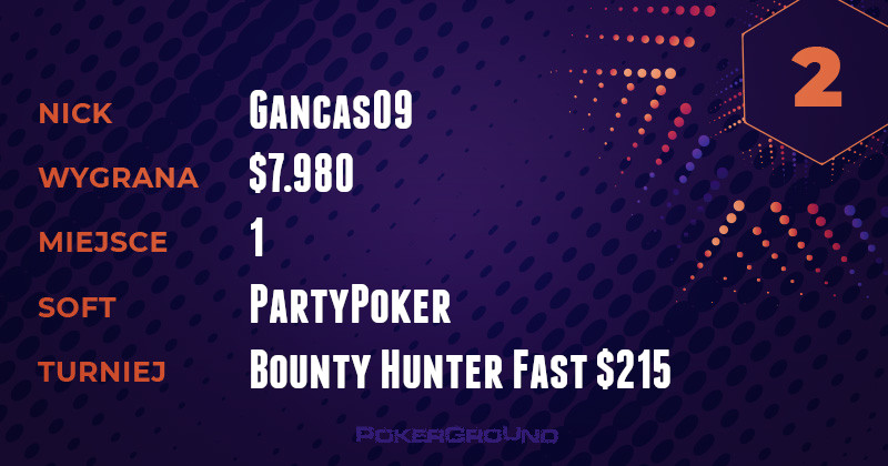 Miejce drugie w zestawieniu jest jednocześnie najwyższym rezultatem z platformy PartyPoker. Jego autorem jest Gancas09, który nie miał sobie równych w rozgrywce Bounty Hunter Fast $215. Za swój wyczyn zainkasował $7.980.