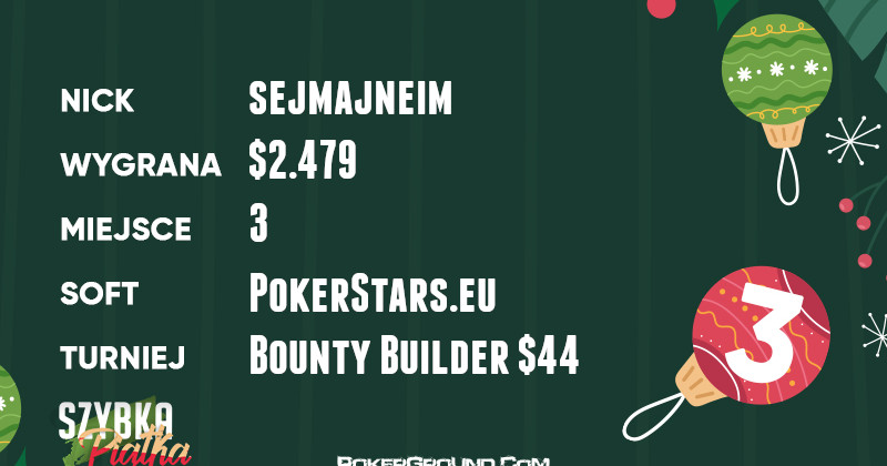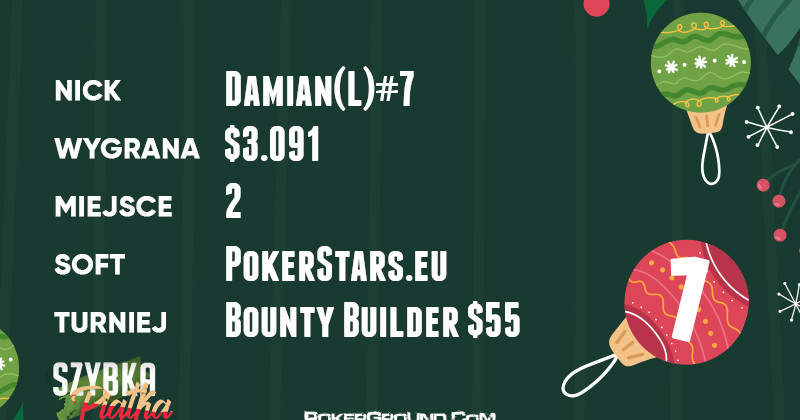 Żółty plastron lidera przyodziewa dzisiaj Damian(L)#7. Nasz gracz dzielnie poczynał sobie w rozgrywce Bounty Builder $55, gdzie finalnie zabrakło pary w pojedynku heads-up. Wypłata za drugie miejsce wyniosła $3.091.