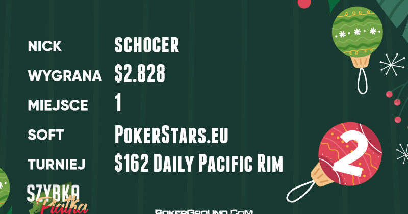 Schocer, wicelider zestawienia, jest równocześnie jedynym graczem, który wczoraj zwyciężył w turnieju. Rzecz miała miejsce w stałej, porannej rozgrywce $162 Daily Pacific Rim. Za swój wyczyn otrzymał $2.828.