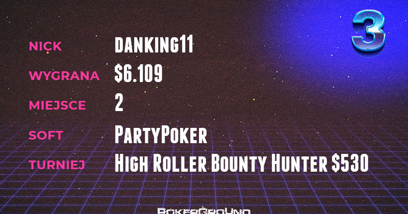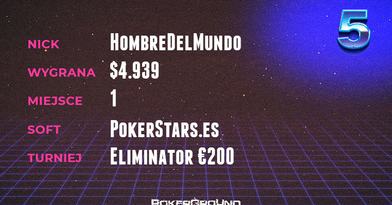 O poziomie zestawienia niech świadczy wynik grindera, który tabelę dzisiaj zamyka. Gracz o nicku HombreDelMundo nie miał sobie równych w rozgrywce Eliminator €200, która miała miejsce na platformie PokerStars.es. Za swój wczyn otrzymał $4.939.