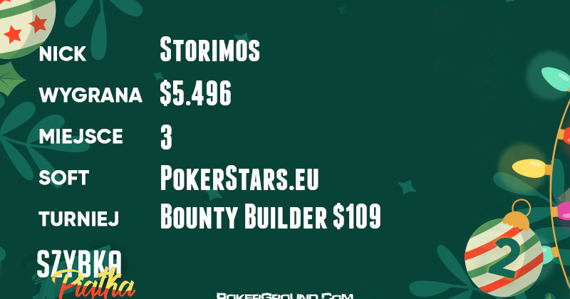 Z perspektywy dzisiejszego rankingu najważniejsze rozstrzygnięcia zapadły w rozgrywce Bounty Builder $109, gdzie na finałowym stole mieliśmy dwóch przedstawicieli. Na trzecim miejscu zameldował się Storimos, a z kolei na drugim zwycięzca zestawienia – wantme1234.